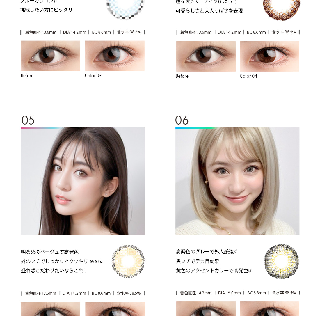 - ナチュラルすぎるのは物足りない方:黒目でもしっかり色が乗り、レンズのフチまでデザインされているため、遠目からでも印象的なデカ目になれます。
